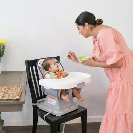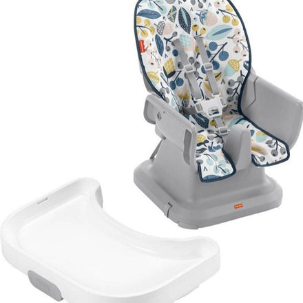 Details: You and your little foodie will have everything you need from a full-size high chair in a compact and portable seat with the Fisher-Price SpaceSaver Simple Clean High Chair. The wraparound, deep-dish tray helps keep baby from pushing food onto the floor, and the tray liner easily lifts out for quick cleaning in the dishwasher. With 3 recline positions, you can adjust the seat’s position to grow with baby over time and even convert the chair to a toddler booster seat! Max weight: 50 lbs (23 kg). Use upright position only with a child who is able to sit up unassisted.