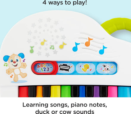 With four ways to play, the Fisher-Price Silly Sounds Light-Up Piano keeps your mini-musician busy 'composing' and learning all playtime long. As your baby presses the keys of this light-up piano, they're rewarded with either real piano notes, delightful duck sounds, silly cow sounds, or playful songs and phrases about colors, numbers, and shapes! And with an easy-grasp handle, you can take the silly musical fun wherever you and your baby go! As your mini-Mozart progresses from batting at the keys to using their little fingers to push each key, and grasping the slider to move it back and forth, they're strengthening dexterity and hand-eye coordination.