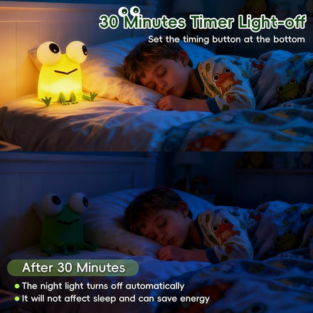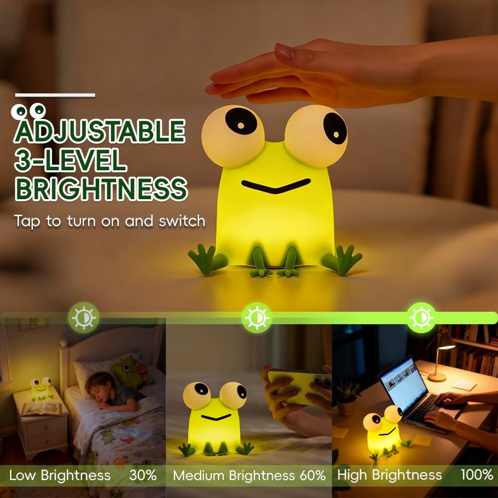 • 【Dimmable and Timer】This frog night light has three adjustable brightness levels. You can tap the frog lamp to adjust the brightness according to different usage needs. It also has a timing function, which can be set to turn off after 30 minutes, allowing you to fall asleep peacefully while saving energy