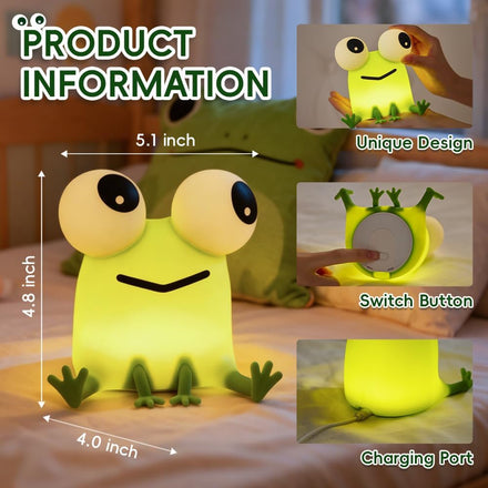 Big-Eyed Glow for Sweet Dreams - Frog Silicone Night Light Lights Up the Night! This cute and kawaii frog night light is not only practical and can serve as a cozy sleeping companion for you or your children, but also a unique decoration that can add warmth and vitality to your room. You and your child will definitely be captivated by it! 1.Restful Sleep Companion: Light up dreams and warm every moment for you. This frog night light can help you dispel the darkness and accompany you to sleep peacefully with its warm light. The material is soft and safe, and the light is soft, so you don't have to worry about irritating your eyes. 2.Diverse functions: This frog night light can be turned on and the brightness can be adjusted by tapping. There are three brightness levels that can be adjusted to meet your different needs. There is also a 30-minute timer switch at the bottom to save energy. 3.Rechargeable: The package is equipped with a charging cable, which can help charge the frog night light. It can be used continuously for several hours after being fully charged. It is also convenient to carry if you need to go out. 4.Widely Applicable: This frog night light combines practicality with aesthetic appeal, making it ideal for holiday gifts, room decoration, and theme parties. 【Package Contents】: A frog silicone night light, a charging cable and an instruction manual are packed in an exquisite packaging box. 【Product Size】: Package Size: 5.1 x 4.0 x 4.8 inch Product Size: 4.8 x 3.8 x 4.8 inch