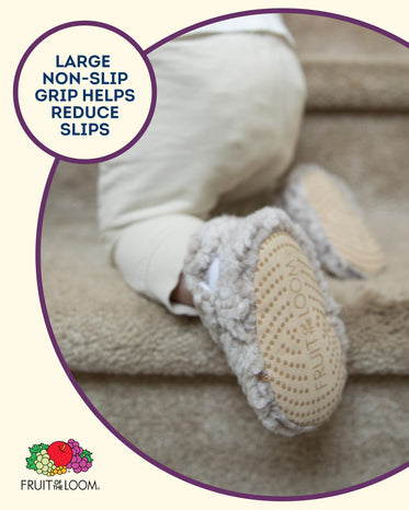 • NON-SKID: The Fruit of the Loom logo on the bottom of the slipper isn't just there to help you to remember your favorite basics brand. It's made from our non-skid rubber material to minimize slips and falls on tile or hard wood floors.
