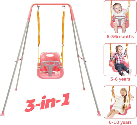 FUNLIO Toddler Swing with Foldable Metal Stand for Aged 1~10 Years, 3-in-1 Baby Swing Set with 4 Sandbags for Backyard, Kids Swing Set for Indoor/Outdoor Play, Easy to Assemble & Store, Pink