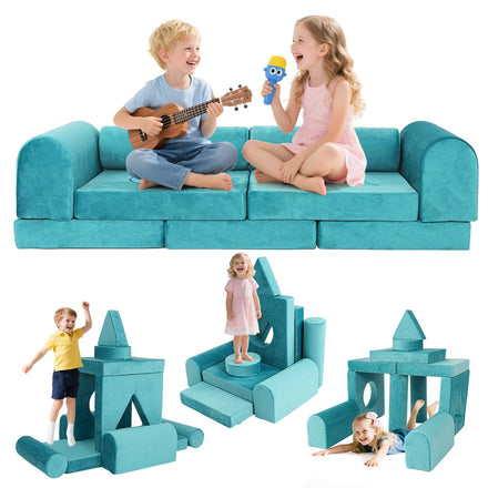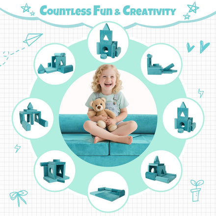 - Modular Build-a-Fort Design: Spark Infinite Creativity Features 11 interlocking foam pieces in varied shapes, allowing kids to build sofas, forts, loungers, or custom structures—no limits to imagination. When set as a sofa, it offers a 17.3" back height, 56.6" length, and 28.3" depth for cozy seating. Perfect for solo play or collaborative build
