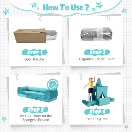 - Compression Recovery for the kids modular couch and play sofa: Fluff Up Fast! Due to shipping compression, the foam of this kids modular couch (also a versatile play sofa) may flatten initially. Quick fix: Unzip all pockets of the play sofa immediately, let the kids modular couch expand for 3 days—soon, it’ll bounce back to full, fluffy thickness