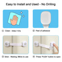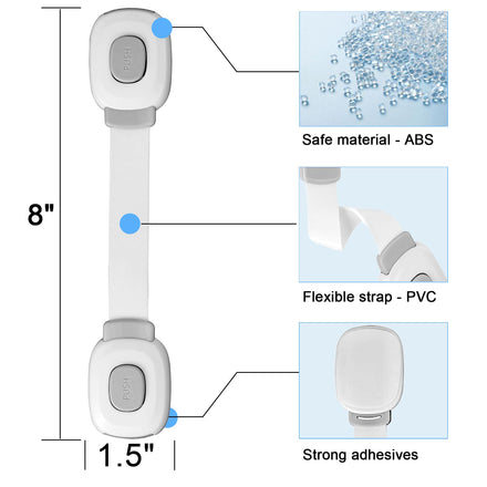 • Easy to Install Baby Safety Cabinet Locks: Strong adhesive industrial-grade tape on both sides of the child safety cabinet lock, No drilling screw or any special tools needed! so you can install and remove them within seconds, causing no damage, mar or remaining any marks on your furniture. and child safety strap locks are easy to use for adults but nearly impossible for a child to figure out - even if they can, they lack the finger strength to depress the buttons easily