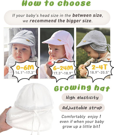 • Infant Hats grows with your baby; the baby hat has three sizes to suits most Kids; Size 0-6 Months suitable for baby Hat circumference:14.1-17.3 inches; Size 6-24 Months suitable for baby Hat circumference:17.3-18.9 inches; Size 2-4 Years suitable for baby Hat circumference:18.9-20.5 inches; Besides, you can adjust the size by the cotton strap at the back to match your baby's head