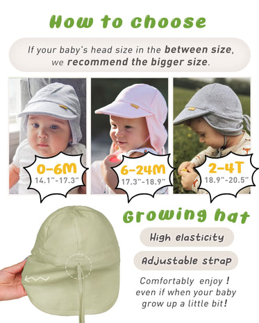 • Infant Hats grows with your baby; the baby hat has three sizes to suits most Kids; Size 0-6 Months suitable for baby Hat circumference:14.1-17.3 inches; Size 6-24 Months suitable for baby Hat circumference:17.3-18.9 inches; Size 2-4 Years suitable for baby Hat circumference:18.9-20.5 inches; Besides, you can adjust the size by the cotton strap at the back to match your baby's head