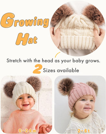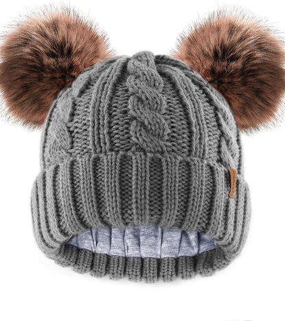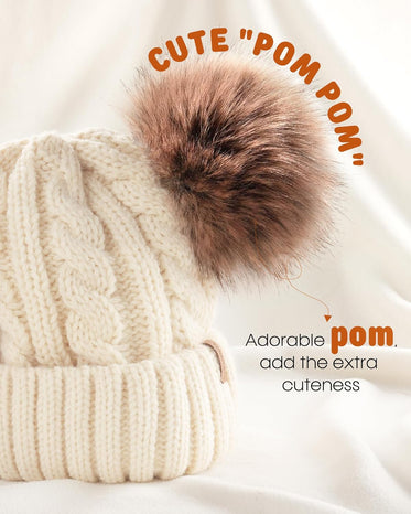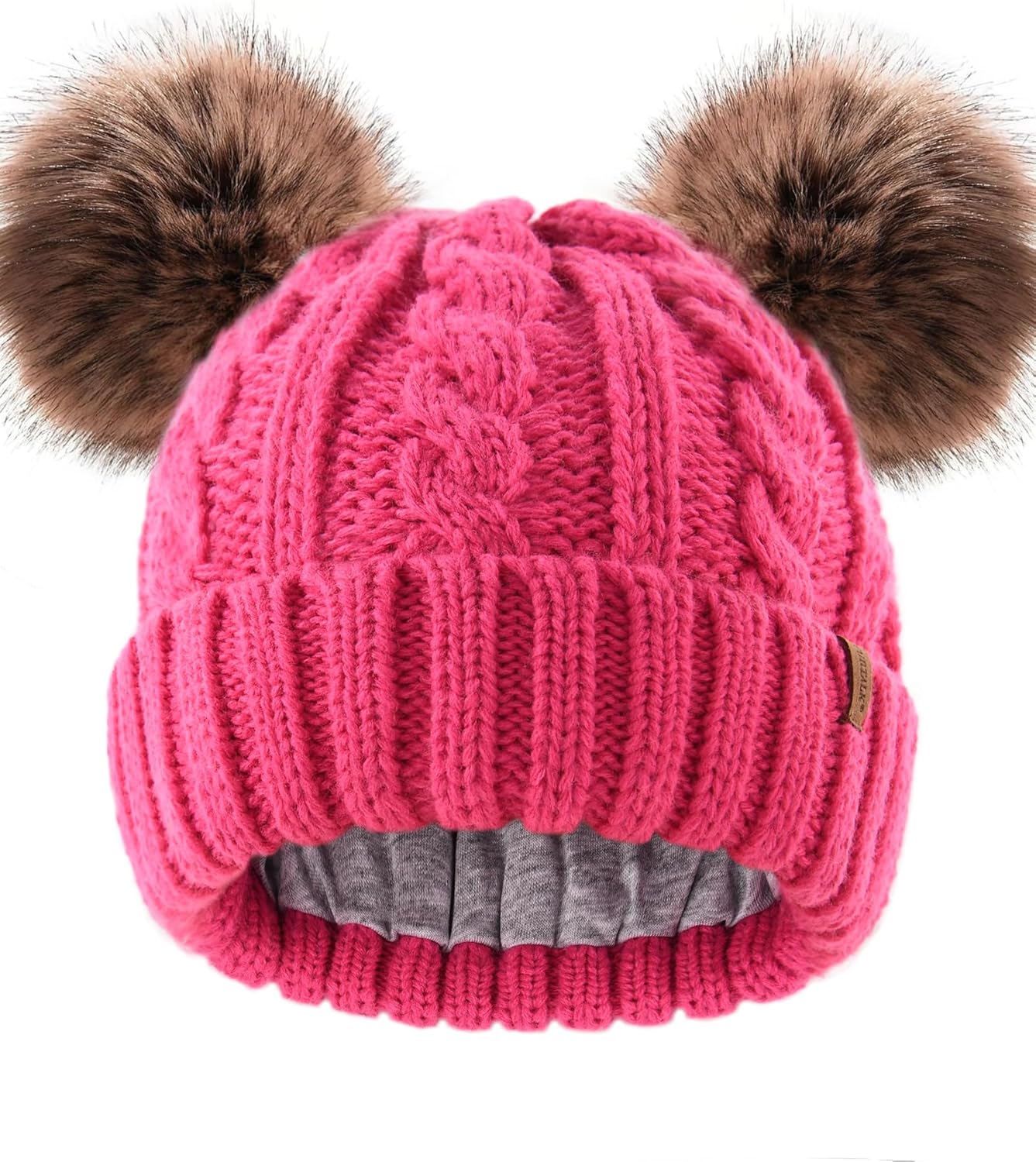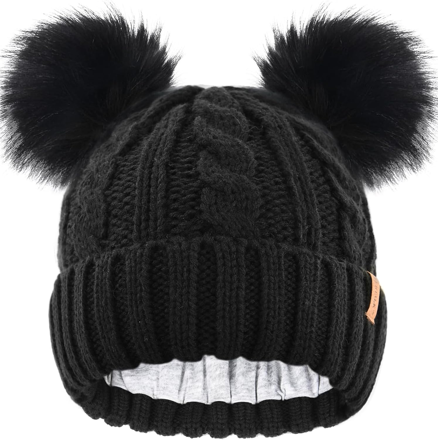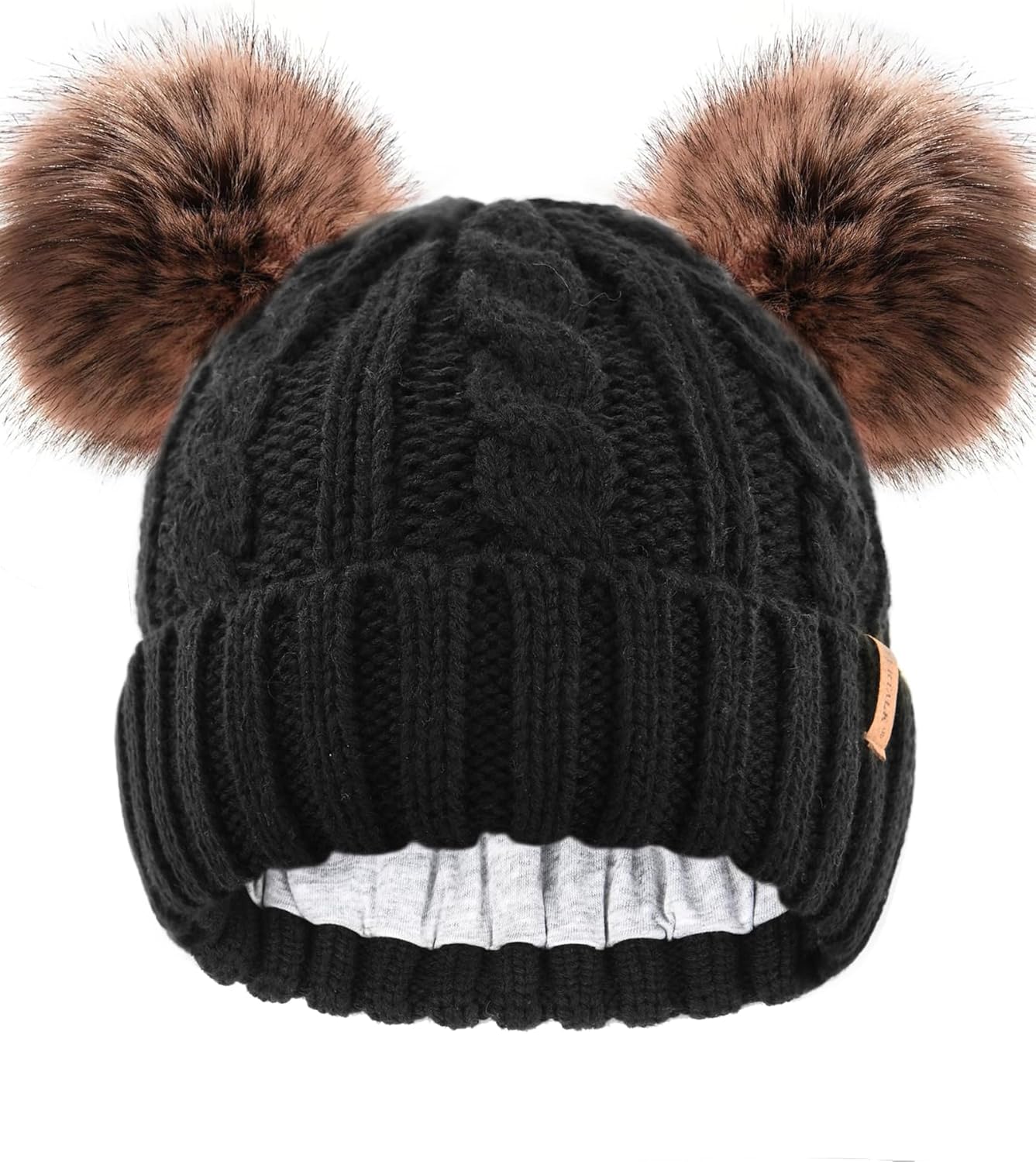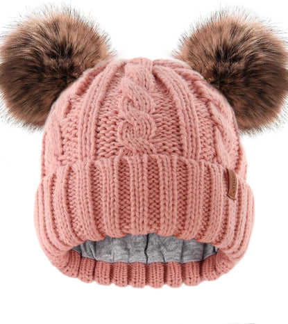 • DOUBLE POM POMS DESIGN: The kids winter hat is designed with double pom poms.This kids’ beanie cap will look fabulous on your little angel and is perfect knit hat will keep your kid so warm and cuddly,can add pop of style and fun with some cute boots or a winter coat.