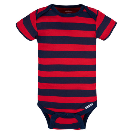 Your little boy will start the day looking his best dressed in one of these Gerber Onesies brand short sleeve bodysuits! Moms and dads will appreciate the higher-in-the-front bottom nickel-free snaps closure that makes for fast and easy diaper changes. 100% cotton rib for breathability and comfort. Mix and match with your favorite bottoms to create a complete look. An essential item for new parents, great for gift giving.