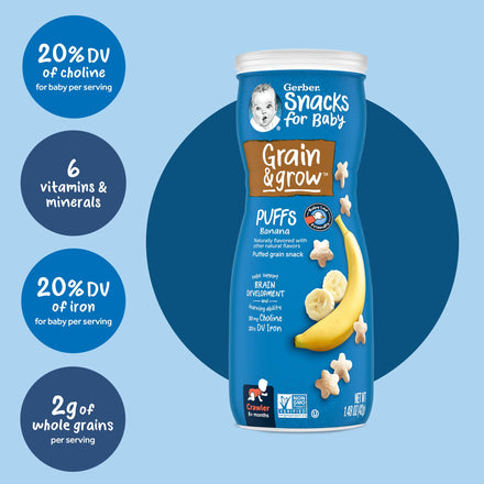 Details: Nourish your little one with whole grain goodness by serving Gerber Puffs at snack time. Gerber Puffs have 2 grams of whole grains per serving, and 5 vitamins and minerals making them an ideal snack for your older baby learning to self feed. Gerber Puffs are easy to chew and swallow and are just the right size for little hands to pick up and enjoy.