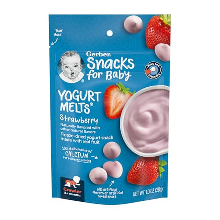 Make every little bite count with the goodness of Gerber Yogurt Melts Freeze-Dried Yogurt & Fruit snacks. These tasty snacks are made with real yogurt and fruit and no artificial flavors or artificial sweeteners. Gerber Yogurt Melts are an ideal snack for your older baby learning learning to self feed with pieces that are perfectly sized for picking up and a melt-in-your-mouth texture for easy chewing and swallowing.