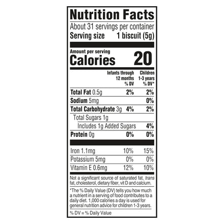 Gerber Arrowroot Cookies are the perfect first baby biscuits with a delicious taste little ones love and the wholesome nutrition parents love. Gerber biscuits are made with no artificial sweeteners, flavors or colors and they have 10% daily value or more of vitamin E, zinc, iron and calcium. Perfectly sized for learning to hold, these yummy baked snacks are specially designed to soften quickly and are easily mashed with or without teeth, making them easy to chew and swallow. These baked biscuits are an ideal finger food for crawlers who are accustomed to chewing solid foods. Keep this resealable bag of arrowroot cookies on hand for easy baby snacks.