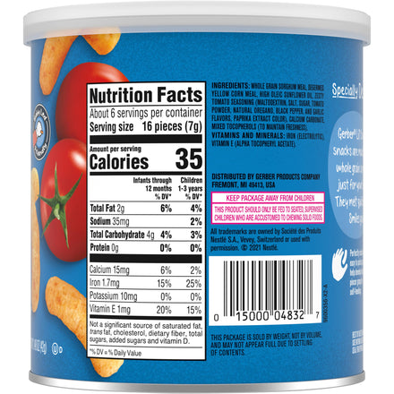 Details: Make every little bite count with a snack designed just for your older baby with Gerber Lil Crunchies Garden Tomato Baked Corn Snacks. These Gerber baby snacks come in a delicious garden tomato flavor to introduce your little one to new tastes. Each serving of non-GMO baked snacks is made with 2 grams of whole grains and 20% daily value of vitamin E. They never contain any artificial flavors or artificial colors. These Gerber snacks have a meltable texture that dissolves easily and is easy to chew and swallow. Perfect as finger food for crawlers, these baby food snacks are sized just right for older babies learning to pick things up. Feed these snacks to seated, supervised babies who are used to chewing solid foods. Use within five days after removing the seal from this reclosable container.