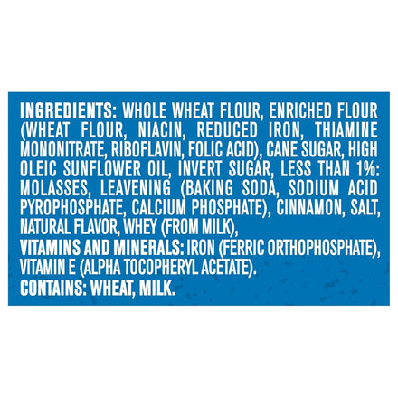 Gerber Animal Crackers Cinnamon Graham Crackers are yummy baked snacks that come in fun animal shapes sure to bring a smile to your little one's face. Cinnamon flavor adds a special touch to these snack crackers. These graham cracker cookies provide 2 grams of whole grains per serving and have 3 essential minerals: calcium, iron, and zinc. Gerber toddler snacks are made with no high fructose corn syrup, synthetic colors, artificial flavors or artificial sweeteners. Ten different animal shapes make snack time fun with cute designs to discover together, and they're the perfect size for toddlers to pick up and practice self-feeding skills. Enjoy these cinnamon grahams at snack time with your toddler seated and supervised. The resealable bag keeps these cinnamon cookies fresh and portable.