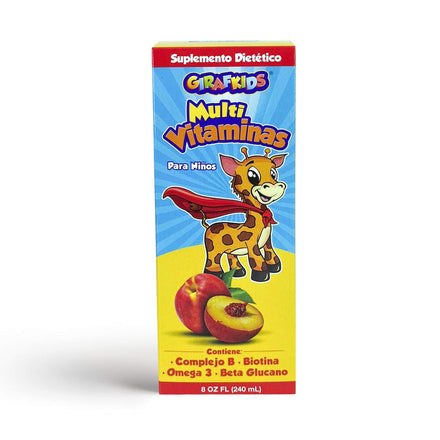 GirafKids Multivitamin Syrup for Children, 8oz | Daily Multivitamin for Kids Ages +4 with Omega-3, Beta Glucan & Folic Acid for Energy and Growth | Delicious Peach Flavor | Liquid Dietary Supplement