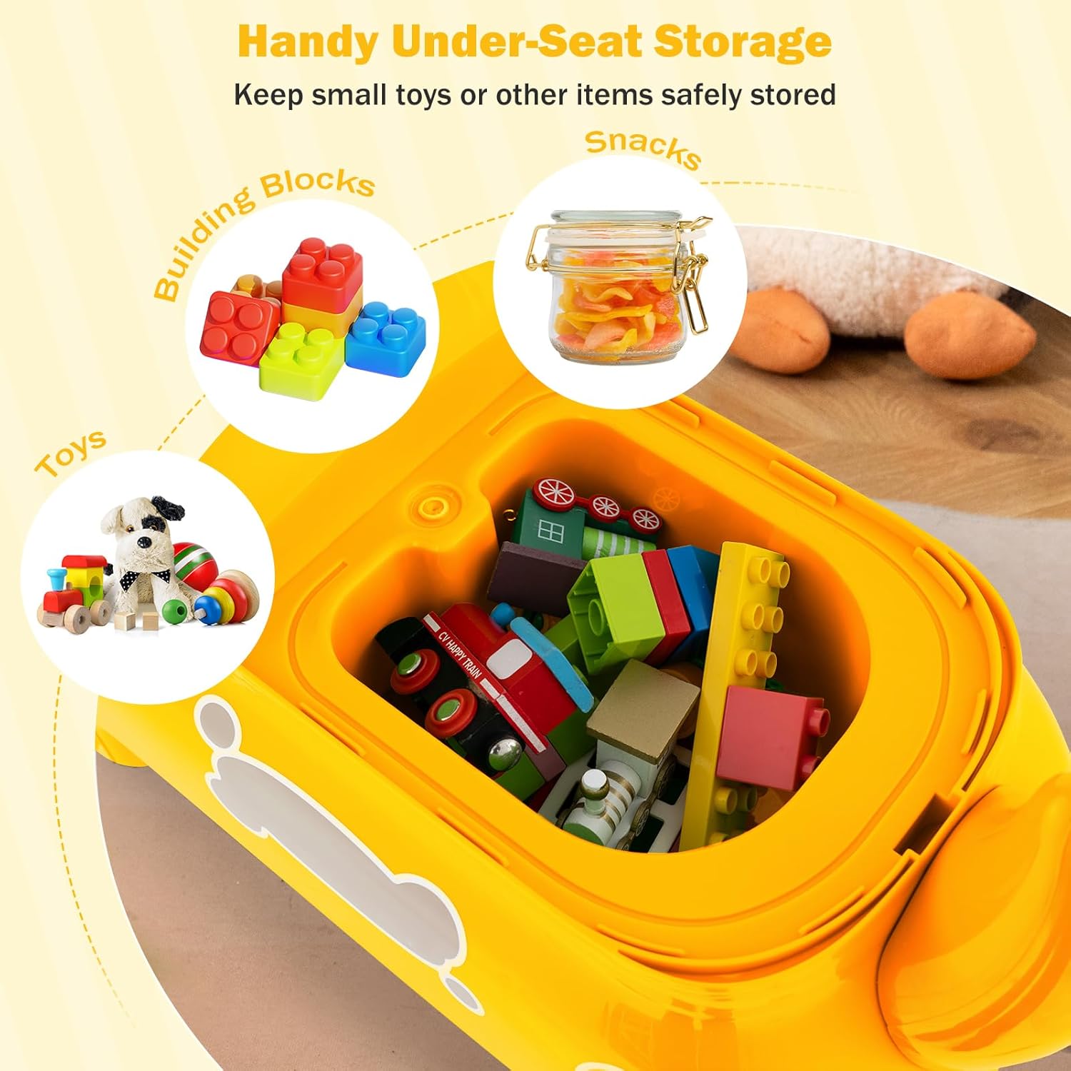 • Hidden Storage Drawer Design: Lift the seat panel to reveal a concealed rectangular drawer with rounded edges. It safely stores building blocks, small picture books, snacks, or clothing. Hidden clips secure the drawer to the seat panel, preventing accidental opening during rides while maintaining a clean aesthetic and ensuring safety.