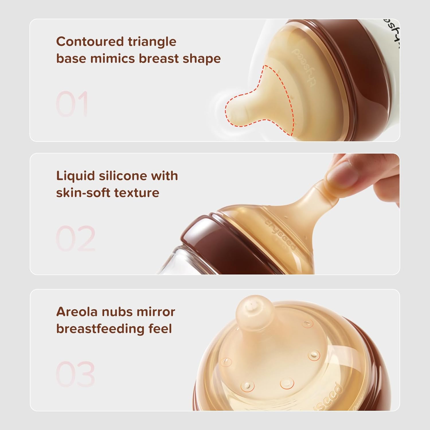 • Switch Effortlessly, Latch Naturally:Breast-like shape and soft-textured base mimic mom’s natural feel — babies embrace the bottle without resistance, making mixed feeding calm and frustration-free.