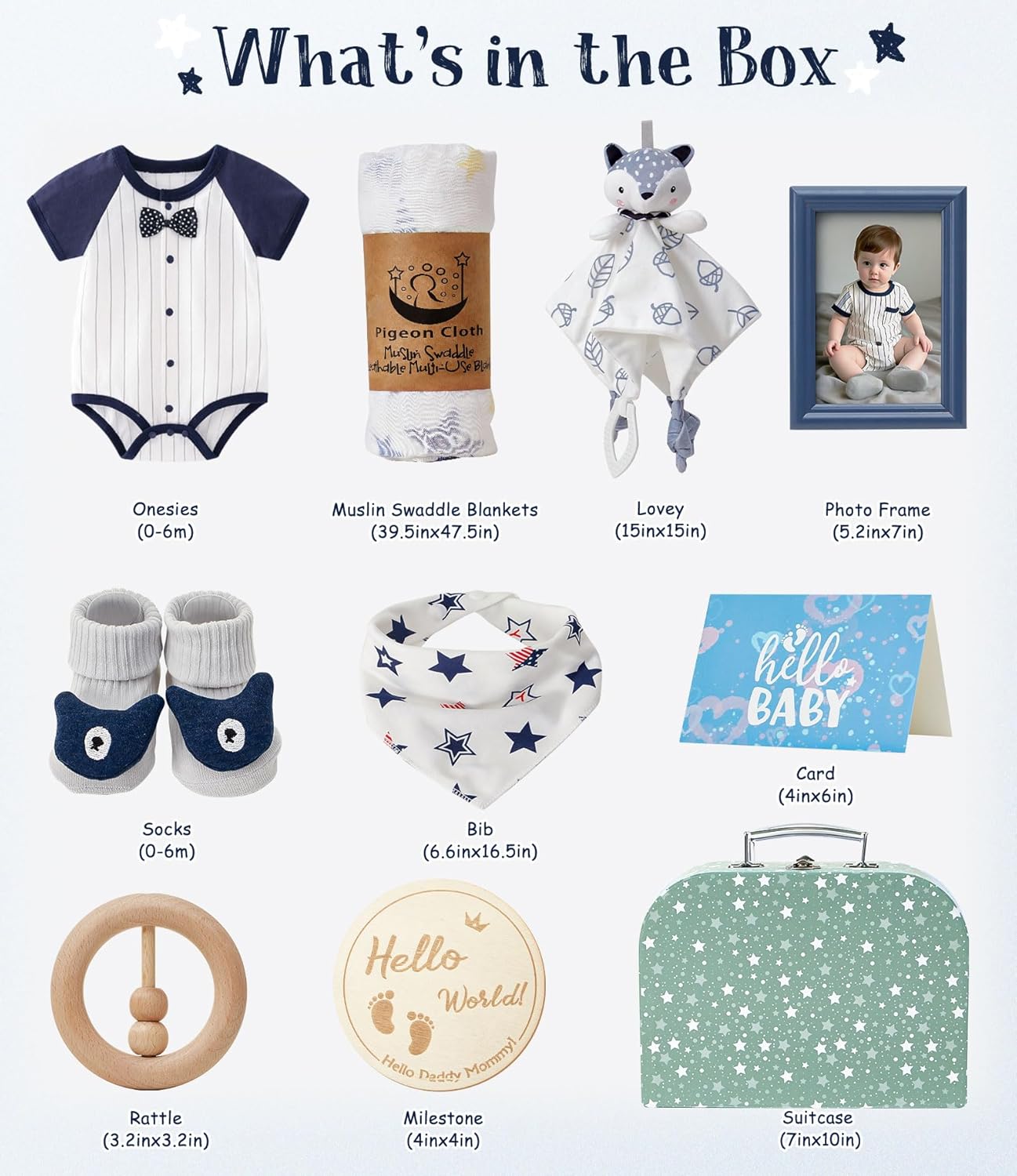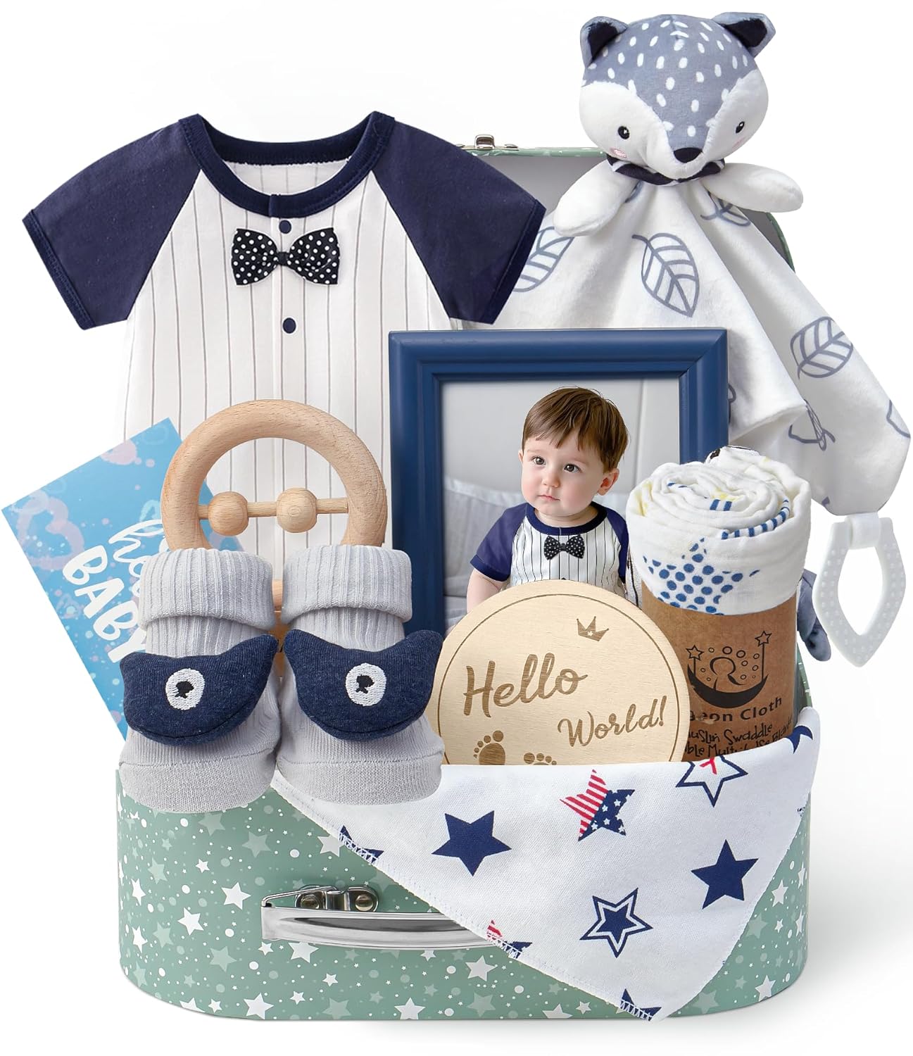 • 10PCS BABY GIFT SET: Struggling to find a gift for an expecting mom? Our baby boy gifts for baby showers make it easy! It includes a suitcase, a cozy muslin swaddle blanket, a soft onesie, adorable socks, a bib, a comforting lovey, milestone cards, a rattle, a photo frame, and a greeting card. The suitcase with an alloy handle doubles as a delightful gift box and practical storage solution