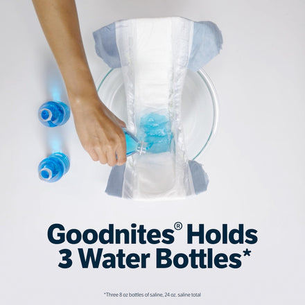 - Goodnites Nighttime Underwear holds three water bottles*** (***Three 8 oz bottles of saline, 24 oz. saline total)