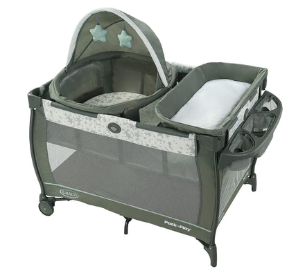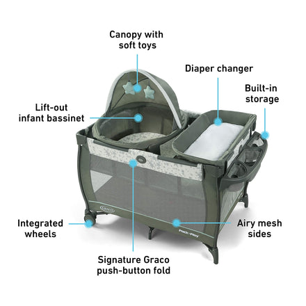 Details: Graco's Pack 'n Play Travel Dome Playard features a travel bassinet that can be used in or out of the playard so you can keep baby by your side in any room. This playard includes a removable diaper changer with wipe-clean fabrics and an integrated storage area for baby's essentials. The Graco playpen transitions with baby and can convert into a full-size bassinet and a toddler playard with wheels for easy mobility around the home. Graco's signature push-button fold makes it easy to fold up for storage. With Graco's Travel Dome playard, baby can have sweet dreams right by your side.