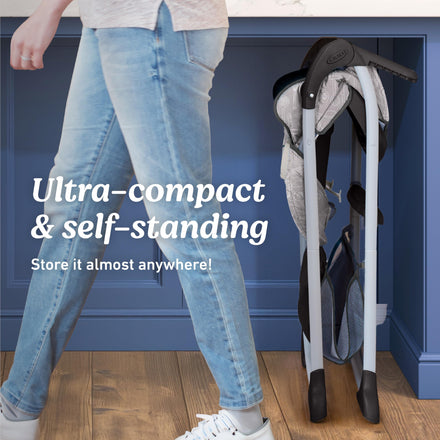 • Ultra-slim folding high chair is designed to fit in compact spaces