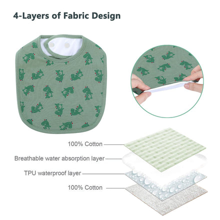 • SUPER SOFT AND ABSORBENT Waterproof Bibs:These baby bibs are designed with 4 layers, the surface and bottom layers are made of 100% organic cotton to ensure softness and absorbency, and the middle two layers are made of water-repellent polyester, 100% waterproof TPU layer to prevent spills from leaking out the other side and keep baby clothes dry.