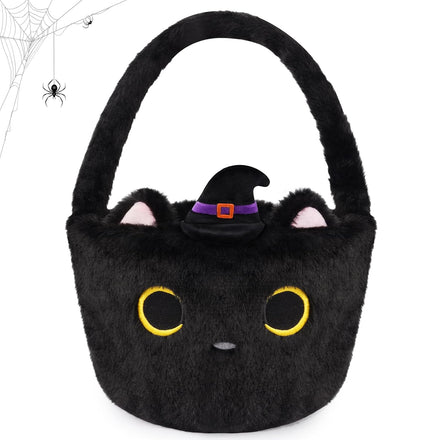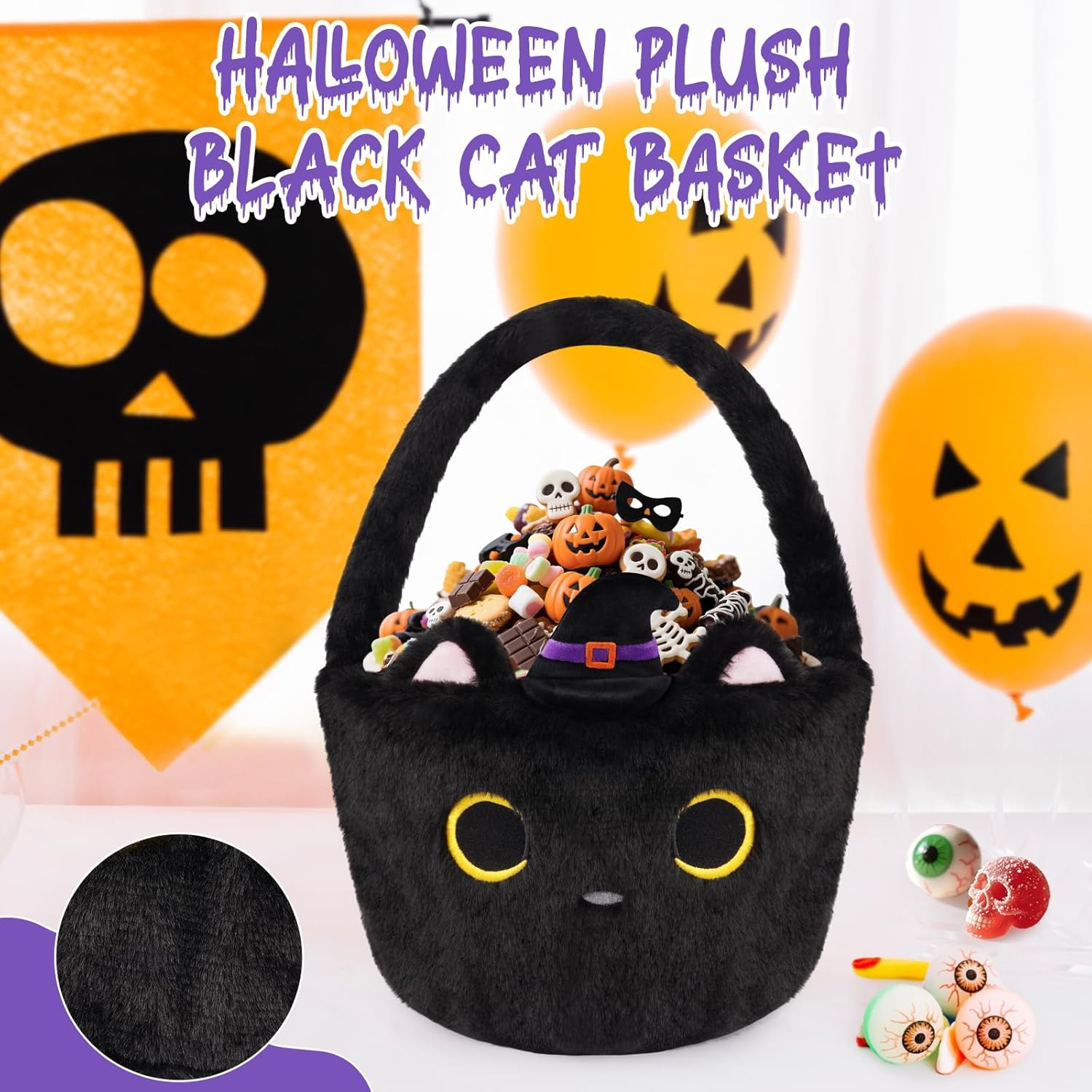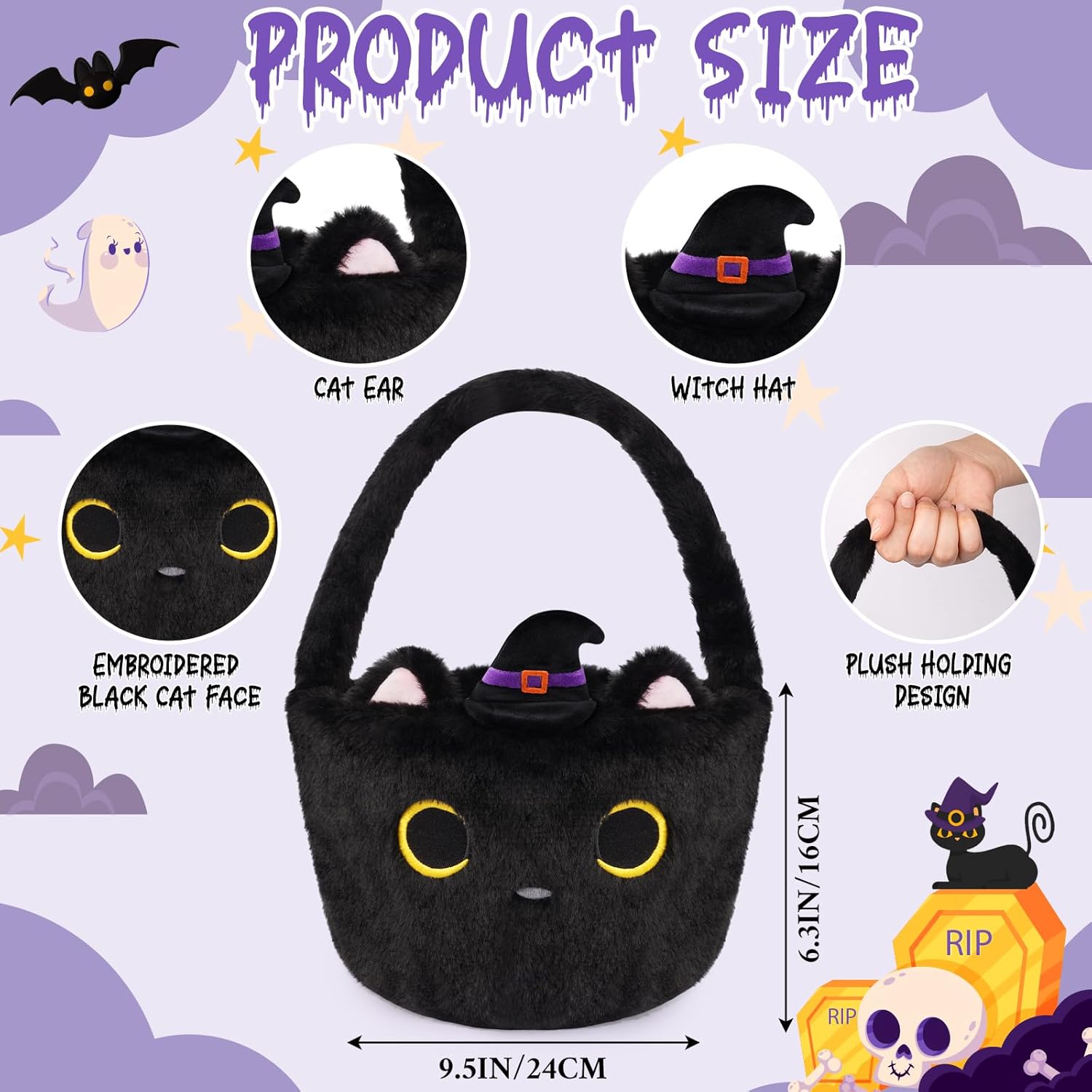 • Halloween Black Cat Plush Basket: This Halloween basket is made of plush, embroidered black cat face and a witch hat. It perfect the mysterious of Halloween and is an ideal choice for Halloween decoration or candy storage.