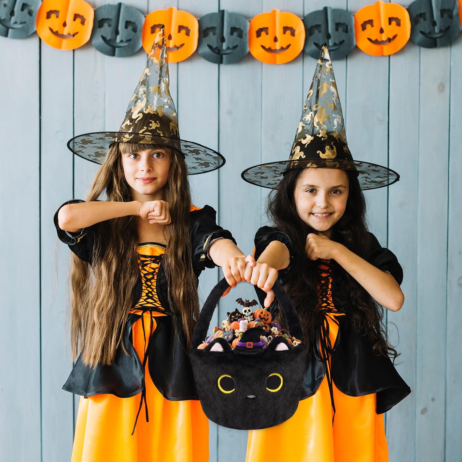 Halloween Basket, Black Cat Plush Halloween Baskets for Kids, Trick or Treat Bucket, Black Cat with Witch Hat Decor, Gift Candy Bucket with Handle for Halloween Party Home Decoration Bins