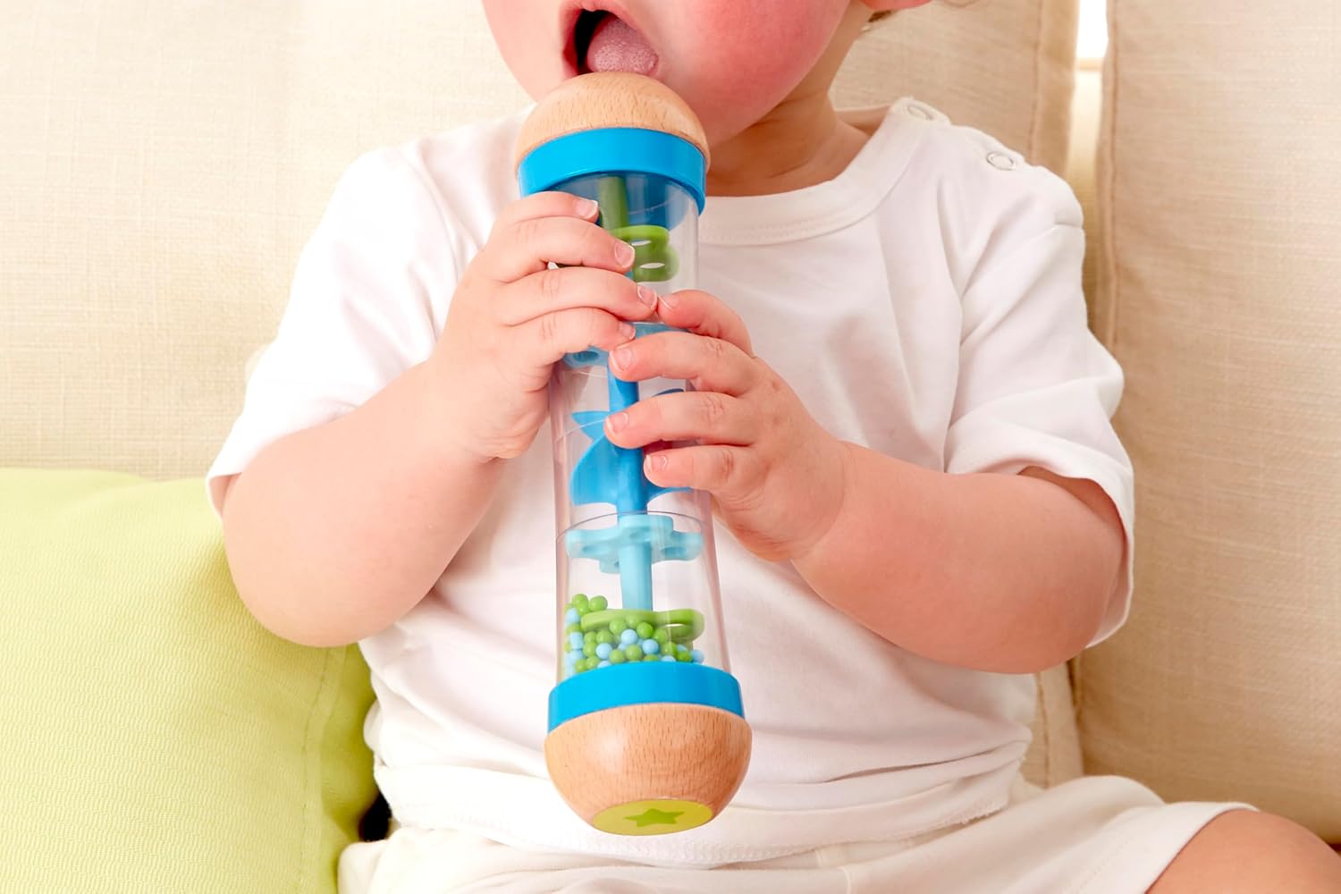 • BRIGHT COLORS: The shake and rattle rainmaker features bright blue and green colors that will leave your little one in awe as the beads trickle up and down