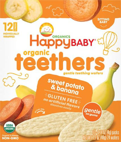 Happy Baby Gentle Teethers Organic Teething Wafers Banana Sweet Potato, Soothing Rice Cookies for Teething Babies Dissolves Easily Organic Gluten Free No Artificial Flavor,0.14 Ounce (Pack of 12)