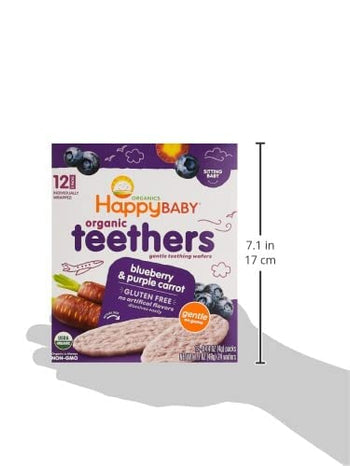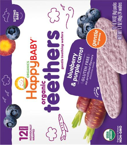 Happy Baby Gentle Teethers Organic Teething Wafers Blueberry Purple Carrot, 0.14 Ounce Packets (Box of 12) Soothing Rice Cookies for Teething Babies Dissolves Easily, Gluten Free No Artificial Flavor