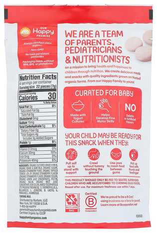 Happy baby organic yogis, strawberry are made by real moms. This product melts in baby's mouth and does not contain gelatin or artificial flavors. Happy baby organic yogis come packaged dry for your convenience in a bpa-free resealable pouch and contains 1 ounce of product. This product is certified USDA organic and contain probiotics to help maintain digestive health.