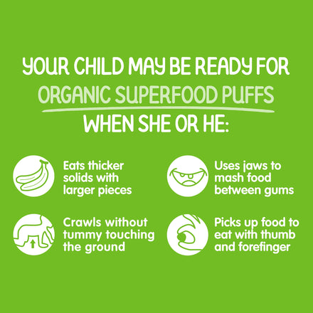 • ORGANIC SNACKS FOR BABY: Happy Baby goes beyond baby food with delicious, superfood puffs and freeze-dried yogurt snacks. Babies may be ready for our delicious snacks when they can crawl on their hands and knees, without their tummy touching the ground.