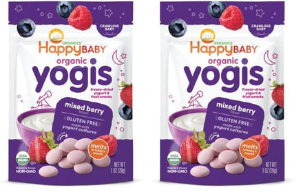 • ORGANIC YOGIS: Little drops of goodness made with real organic yogurt* and organic fruit, Happy Baby Yogis are melt-in-your-mouth, freeze-dried yogurt* drops that provide babies and toddlers with a delicious snack that you can feel good about. Designed to encourage self-feeding, these melts are made for crawling babies. *Does not contain live & active cultures