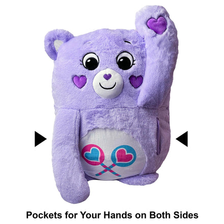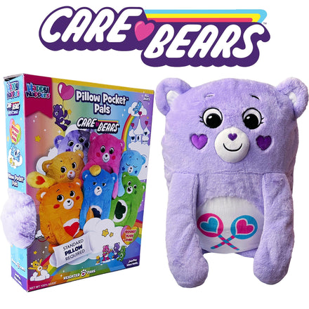 Details: CARE BEARS: PILLOW POCKET PALS - SHARE BEAR - Happy Nappers Care Bears Pillow Pocket Pals are your child's new best friend and snuggly companion. Simply add one standard pillow and they are ready to hug. Happy Nappers Care Bears Pillow Pocket Pals have pockets for your hands to place inside. The material is soft to touch on the outside and super soft to hug on the inside. Hug and Squeeze them over and over again. Feel their weighted paws for soothing fidget comfort. The Paws can rest on your head when it's time for bed or just a fun fidget to squeeze and play all day. Made by Jay at Play the creators of Happy Nappers. (Fits Standard Pillow - Not Included) . Trusted Retailer - Manufactured by Jay at Play, The Creators of Happy Nappers.