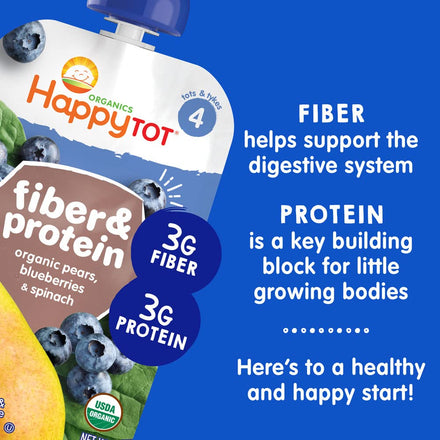 Happy Tot Fiber & Protein pouches help little ones get key nutrients from organic vegetables and fruits, with fiber from fruit, veggies & chia and added protein. Made with wholesome ingredients selected to support this age and stage of tots’ development, protein is an important building block for your tot's muscles, while fiber helps promote digestive health. Happy Tot Fiber & Protein pouches make it easier to provide your picky eater with the nutrition they need!