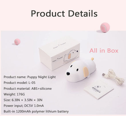 • International Standard:LED puppy night light children built-in 1200 mAh battery, rechargeable LED bedside lamp baby room and companion sleeping light. The cute puppy light can work for about 6 hours. The baby night lamp is portable and wireless, very cute and practical kid's nightlight