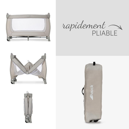 Hauck Sleep N Play Go Plus Portable Baby Travel Cot with Wheels, Mattress, Large Viewing Windows, and Side Exit for Babies and Toddlers, Beige