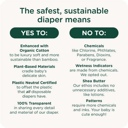 • Verified Safe Diaper for Baby: We are the first EWG Verified Safe diaper, which means our diapers are made free from 2,800+ chemicals and materials banned by the Environmental Working Group. Enhanced with organic cotton and only plant-based materials cradle baby's developing skin.
