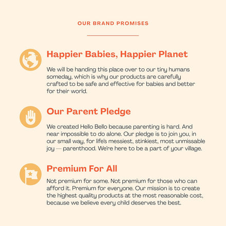 Hello Bello Premium Baby Diapers are designed by parents, so we know first-hand that preventing leaks and blowouts is a must. Been there, done that, don't want to deal with it. We also wanted to create a diaper with ingredients we could be proud of, that was soft on sensitive skin, and was made with just as much consideration for the planet we live on as the babies we love - all at an affordable price. So that's just what we did. Featuring premium, thick leg cuffs for serious leak protection and an advanced core that quickly wicks away moisture to help minimize conditions that lead to irritation. These diapers stay snug when soiled, reducing sag and keeping a secure and comfy fit.