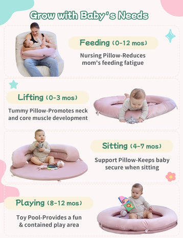 • Versatile Baby Activity Center - Measuring 36" x 36", this baby activity gym provides ample room for tummy time and play. It combines multiple functions, serving as a baby gym, play mat, nursing pillow, ball pit, sit-up support pillow, and safety fence—offering endless possibilities for fun and development.