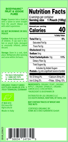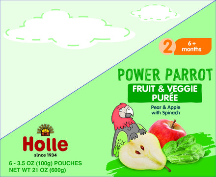 • Healthy Organic Ingredients - Our Power Parrot organic baby food pouches contain a tasty blend of organic pear, apple and spinach. Each of our fruit and veggie pouches is made with100% Demeter-certified, biodynamic fruit, vegetables and grains.