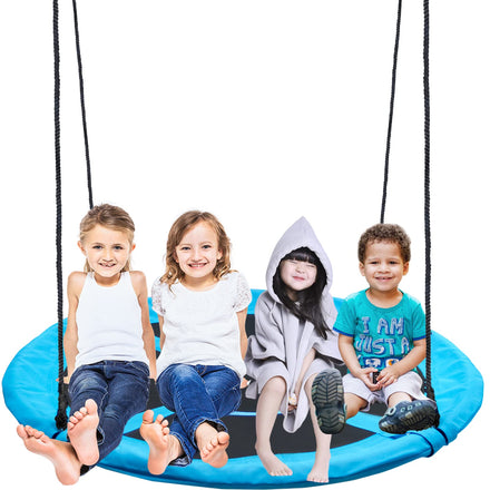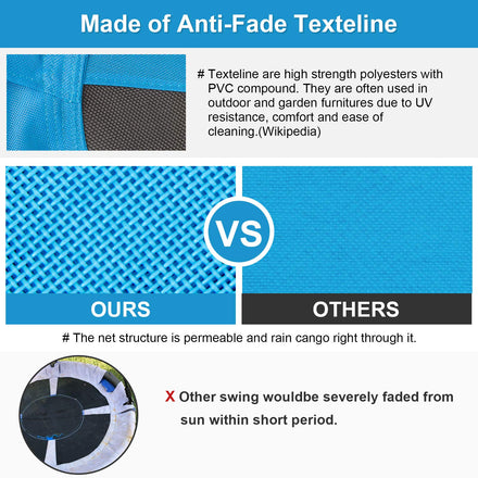 • ANTI-FADE TEXTELINE: Unlike other swing made of cheap fabric, our 60’’ saucer swing (Upgrade Version) is made of Anti-Fade Texteline. Wikipedia said, “Texteline are high strength polyesters with PVC compound. They are often used in outdoor and garden furnitures due to UV resistance, comfort and ease of cleaning.” Thanks to this high quality Texteline, our swing is safer and more sturdy