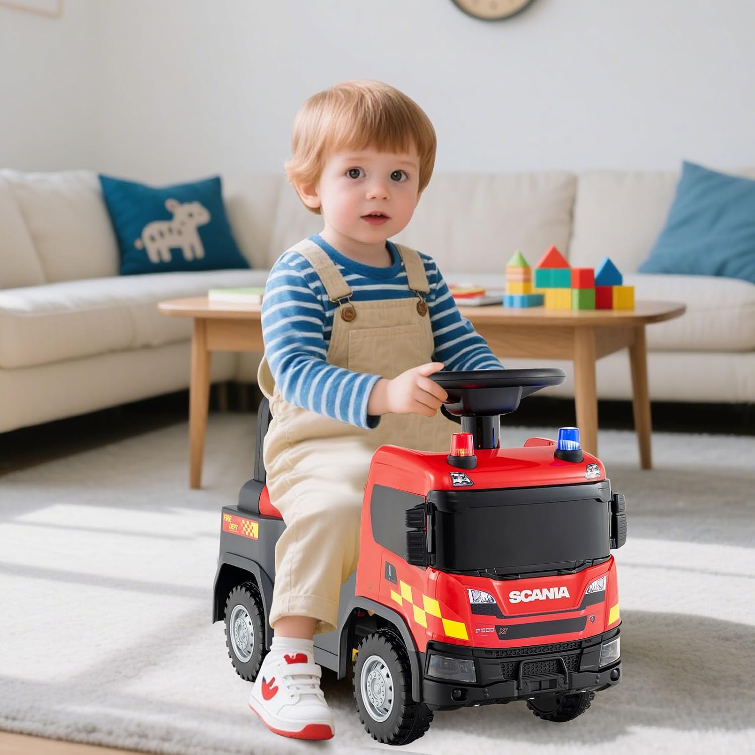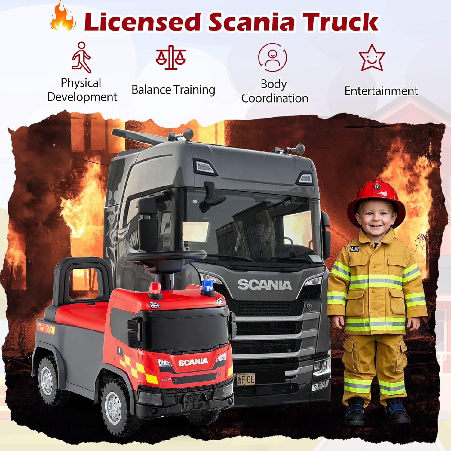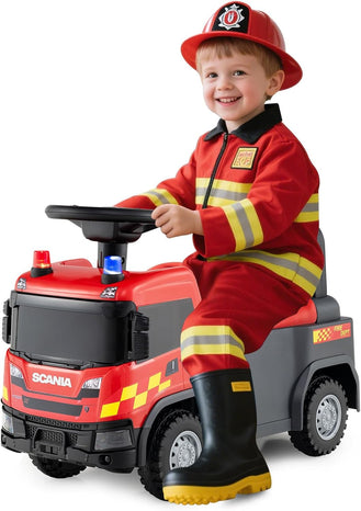 - Authentic Scania Design: Invite your child into the thrilling world of firefighters with the officially licensed Scania ride on fire truck. Designed for tots aged 18 months and up, this ride on push car is a perfect gift for boys and girls to strengthen balance and coordination while delivering hours of fun.