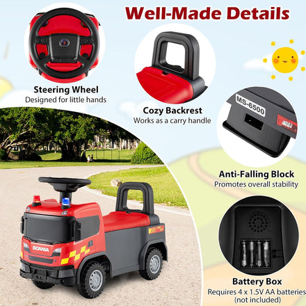 Description: Bring your little one’s firefighting dreams to life with the officially licensed Scania ride on car, perfect for toddlers 18 months and older. This exciting vehicle boosts balance and coordination while thrilling kids with bright emergency LED lights and convenient sound control, including 3 fire-truck alarm wails, engine-start vroom, horn sound, and 3 cheerful tunes - all powered by 4 x 1.5V AA batteries (not included). Built with safety in mind, the push car features a 50° steering limit to help prevent tipping, a comfortable backrest, and an anti-falling block for secure play. Its sturdy, anti-slip wheels roll effortlessly across a variety of surfaces like wood, rubber, asphalt, and cement, making indoor and outdoor adventures possible. Plus, a handy under-seat storage compartment lets children stash their favorite toys or snacks, turning every ride into a fun-filled journey. More well-made details await your discovery. Features: Emergency light control to mimic the urgency of a real emergency Realistic dashboard with energy-saving, safe, and enduring LED lights Steering wheel is designed for little hands Features a cozy backrest that works as a carry handle Under-seat storage to perfectly organize kid’s treasures High-strength wheels to ensure a smooth driving experience Anti-falling block promotes overall stability Applicable to rubber road, wood floor, asphalt road, and cement floor Battery box to accommodate 4 x 1.5V AA batteries (not included) For physical development, balance training, body coordination, and entertainment ASTM and CPSIA compliant, ensuring the using safety Note: The ride on car requires assembly Specifications: Color: Red/Yellow Material: PP, Metal Overall Dimensions: 23” x 11” x 17”/59 x 28 x 43 cm (L x W x H) Seat Dimensions: 12” x 6.5” x 10”/30 x 16.5 x 25 cm (L x W x H) Compartment Dimensions: 8” x 5” x 4.5”/20 x 13 x 11 cm (W x D x H) Suitable Age: 18 Months+ Weight Capacity: 51 lbs/23 kg Net Weight: 6.4 lbs/2.9 kg Package Includes: 1 x Kids Ride On Car 1 x User Manual