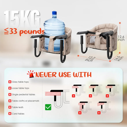 • 【Safe and Secure for Your Baby】The 3-point safety harness, sturdy aluminum alloy clamps, and thick, tear-resistant Oxford fabric ensure your baby is securely fastened and comfortable while sitting in the chair. With a maximum weight capacity of 15kg, this hook on chair is durable and reliable.