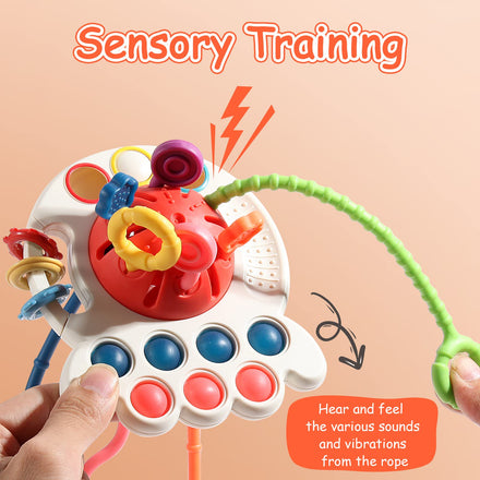 • 【Montessori Octopus Silicone Pulling Toy】The Pull String toy with Slide Buttons, Finger Pressing Bubbles, Soft Textured Ropes and Easy to Hold Grips, will help baby with fine motor skills, hand-eye coordination, sensory exploration, exercise grasping. Baby Pull Toy uses bright colors which inspire baby's vision development, build color recognition.