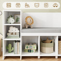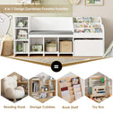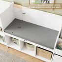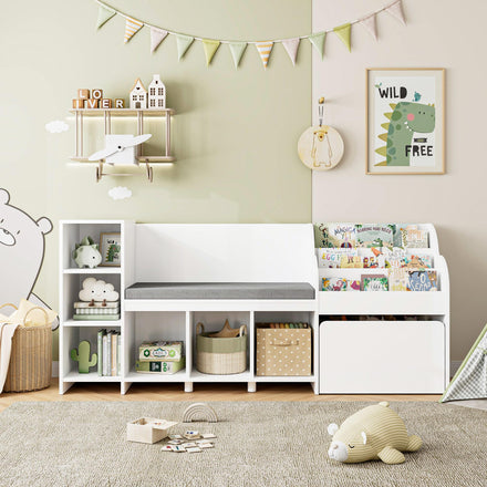 • 4-in-1 Bookshelf: This versatile masterpiece seamlessly integrates storage cubbies, a book rack, a mobile toy box, and a comfortable cushioned seat, forming an organized and joyful play area for your child while offering convenient access to books and toys to keep the space tidy
