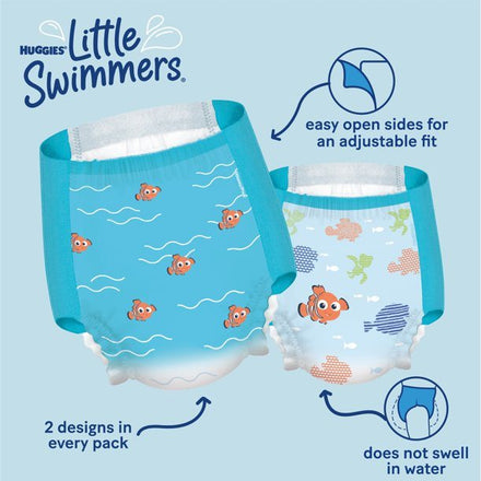 Huggies Little Swimmers are the #1 best-selling disposable swim pants* specifically designed for water use. Enjoy worry-free water fun and let your baby make a splash in Little Swimmers swim diapers! Made with a unique absorbent material that won't swell in water like regular diapers; Little Swimmers give your baby a comfortable fit when wet or dry. For secure protection in the water; Little Swimmers are designed with Double Leak Guards that fit snugly around baby's legs to help contain messes. Made to fit like swimwear; Little Swimmers feature easy open; reclosable sides for an adjustable fit & quick diaper changes even when wet. Plus the soft; stretchy waistband make these swim pants comfortable for baby. Each pack features two Disney·Pixar Finding Nemo designs your child will love. Perfect for the pool; beach; splash park & more! Huggies Little Swimmers are available in sizes 3 Small (16-26 lbs); 4 Medium (24-34 lbs) and 5-6 Large (32+ lbs). (*US L52W data ending 3/6/2021);Huggies Little Swimmers are the #1 best-selling disposable swim pants* specifically designed for water use. Enjoy worry-free water fun and let your baby make a splash in Little Swimmers swim diapers! Made with a unique absorbent material that won't swell in water like regular diapers; Little Swimmers give your baby a comfortable fit when wet or dry. For secure protection in the water; Little Swimmers are designed with Double Leak Guards that fit snugly around baby's legs to help contain messes. Made to fit like swimwear; Little Swimmers feature easy open; reclosable sides for an adjustable fit & quick diaper changes even when wet. Plus the soft; stretchy waistband make these swim pants comfortable for baby. Each pack features two Disney·Pixar Finding Nemo designs your child will love. Perfect for the pool; beach; splash park & more! Huggies Little Swimmers are available in sizes 3 Small (16-26 lb.); 4 Medium (24-34 lb.) and 5-6 Large (32+ lb.). (*US Nielsen data ending 3/6/2021)