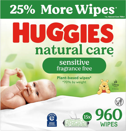 Huggies Natural Care Sensitive Baby Wipes are designed to help keep baby’s skin clean and healthy. Plant-based*(*70%+ by weight plant-based materials) and made with no harsh ingredients, Huggies Natural Care fragrance free wipes are hypoallergenic and dermatologist-tested and the pH-balanced wipe helps maintain healthy skin for your baby. They're recognized by the National Eczema Association and they're safe for sensitive skin and free of fragrance, alcohol, parabens and phenoxyethanol. With the #1 branded wipe**, you can feel confident you are giving baby a safe, gentle clean. Huggies Natural Care unscented baby wipes, with Aloe and Vitamin E, provide a gentle clean for baby’s skin. These disposable baby wipes come in packaging with cute Disney patterns for a delightful touch that will fit in great on your changing table, in your diaper bag and wherever you need a wipe! Plus, with 1-Handed Dispensing, it's easy to grab wipes with a single hand! (*70%+ by weight) (**Based on US Nielsen data ending 9/4/2021)